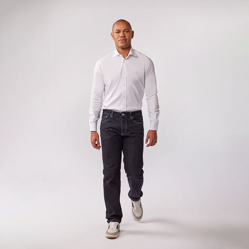 Ce jean droit en denim bleu marine revisite un incontournable du vestiaire masculin avec une touche premium et contemporaine. Il incarne l’esprit « Club House » en mêlant authenticité et élégance décontractée. Sa toile brute, ses surpiqûres contrastées et son patch en cuir co-brandé au dos signent une pièce à la fois moderne et intemporelle